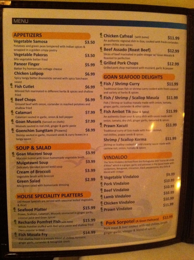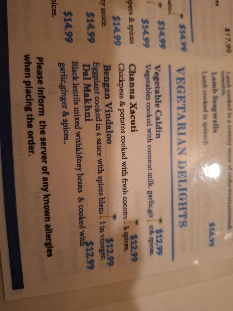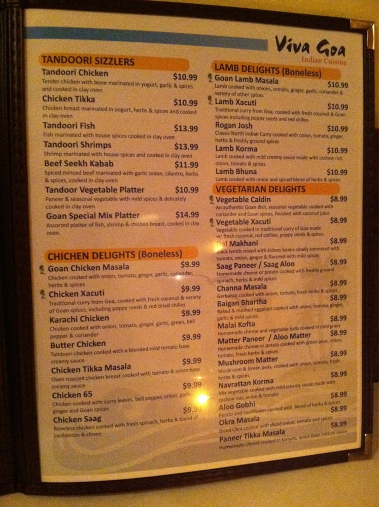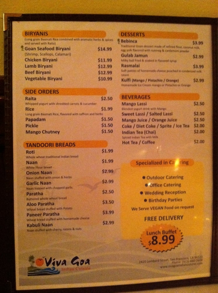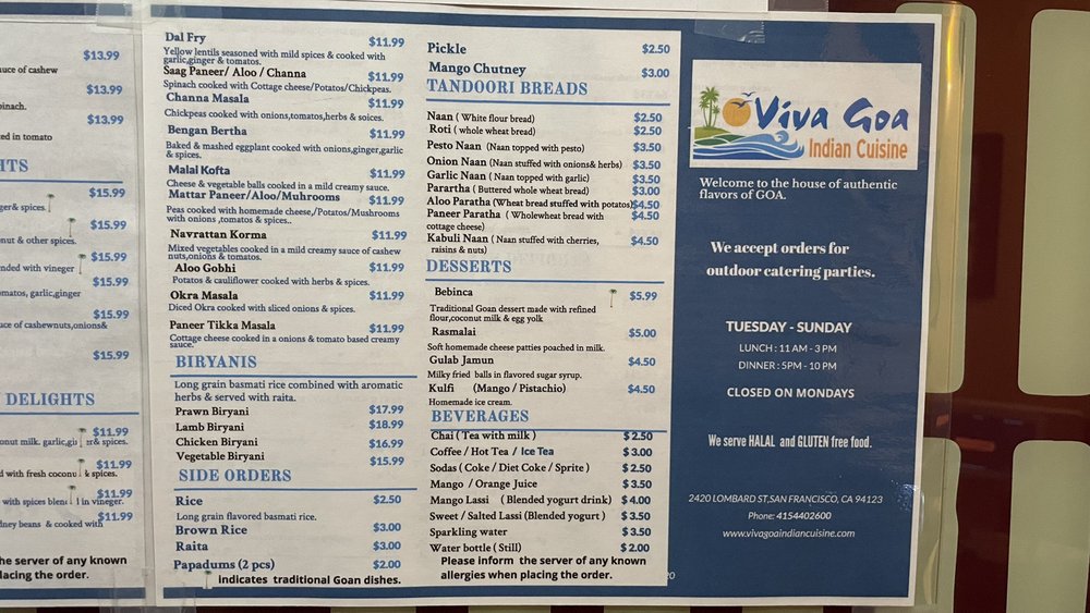 "Introducing the menu at Viva Goa, a gem of a Goan Indian restaurant located in San Francisco, CA. This casual and quiet eatery offers a variety of vegan and vegetarian options along with traditional Asian dishes. The extensive beverage menu includes refreshing mango lassi, sparkling Perrier water, and spiced Indian chai. For appetizers, indulge in vegetable samosas, paneer pakoras, and flavorful Goan salads. Customers rave about the Prawn Korma, Dal Fry, and Tandoori fish, all bursting with authentic flavors. The cozy ambiance and excellent service make Viva Goa a must-visit for a low-key date night or a delicious dinner with friends. Don't miss out on the signature fish curry and shrimp Xacuti, true highlights of this culinary experience."